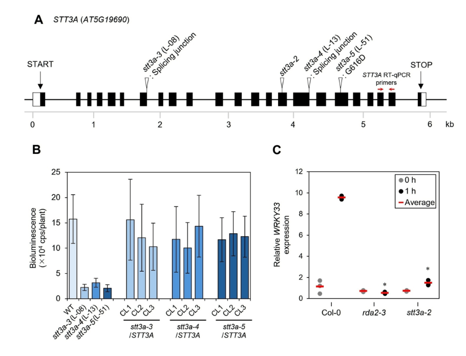 Plants recognize pathogen-associated molecular patterns (PAMPs) via pattern recognition receptors, leading to the activation of pattern-triggered immunity in response to pathogen attack. Phytophthora infestans ceramide D (Pi-Cer D) is a sphingolipid from the oomycete pathogen P. infestans. Pi-Cer D is cleaved by the plant extracellular ceramidase NEUTRAL CERAMIDASE 2 (NCER2), and the resulting 9-methyl-branched sphingoid base is recognized by the plant receptor RESISTANT TO DFPM-INHIBITION OF ABSCISIC ACID SIGNALING 2 (RDA2) at the plasma membrane to transduce a defense signal. However, additional components are likely involved in sphingolipid recognition, which remain to be identified. Here, we employed a screen based on Lumi-Map technology to look for Arabidopsis (Arabidopsis thaliana) mutants with altered defense responses to Pi-Cer D. We identified three mutants showing diminished responses to Pi-Cer D and elf18, each carrying mutations in STAUROSPORIN AND TEMPERATURE SENSITIVE 3-LIKE A (STT3A), which encodes an oligosaccharyltransferase. The stt3a mutants exhibited higher susceptibility to the pathogen Colletotrichum higginsianum than the wild type. In stt3a mutants, the molecular mass of NCER2 and RDA2 proteins appeared smaller, indicating STT3A is involved in post-translational modification of the proteins. Enzymatic deglycosylation assay revealed that NCER2 and RDA2 are N-glycosylated. These findings suggest that STT3A contributes to plant immunity via post-translational modification of proteins including NCER2 and RDA2.